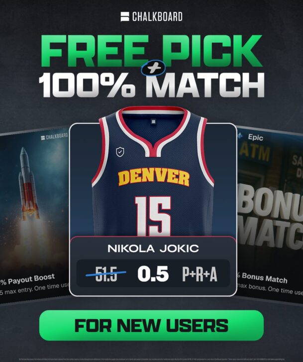 If you haven’t joined the Chalkboard app yet, now’s your moment. Use Chalkboard promo code STIFFS to unlock a 100% deposit match bonus and a free pick entry featuring none other than Nikola Jokić.