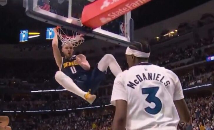 Jokić checked back in with six minutes left as Murray got a brief rest. After missing a second three, he found Spencer in the corner for his 7th assist. Brucey B’s dunk in transition on the following gave the Nuggets a 49-42 lead and brought the crowd to its feet. Jok and Gobert then went at each other on back-to-back possessions, with 15 getting the basket while Rudy missed badly, almost leading to another transition score from Bruce. Bones’ third from deep cut the lead to six, though, with three minutes left in the half. Cam’s two driving layups over Gobert out of the two-man game gave him 11 in the half and expanded the Nuggets’ lead to 57-49. After McDaniels hit a jumper, Jokić nailed a ~30′ trey at the buzzer to get off the snide from outside and secure a 9-point halftime lead.